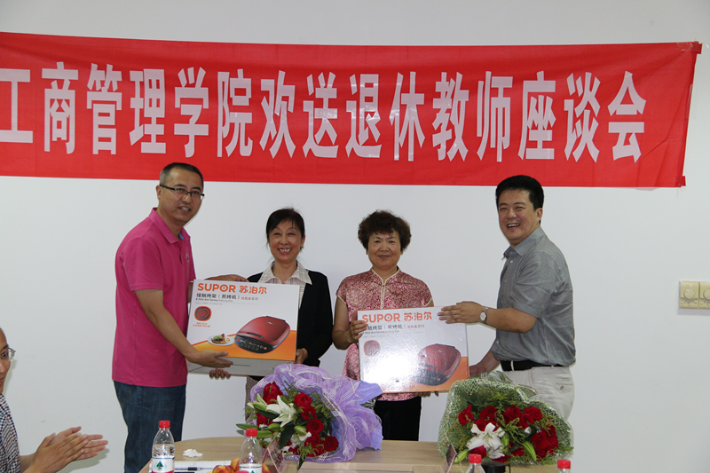 座谈会上,刘军和杨哲向退休教师们赠送了纪念品,青年教师代表向她们献花,并合影留念。