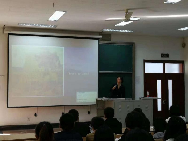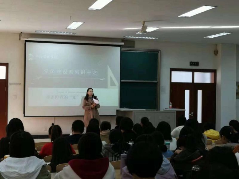 解玲老师以英语世界的“知”与“行”为标题,讲了大学生英语学习规划的有关问题,其中讲述了英语的源头、英式英语与美式英语的区别,还为同学们提出就业需要的证书及可以参加的有关英语的竞赛。