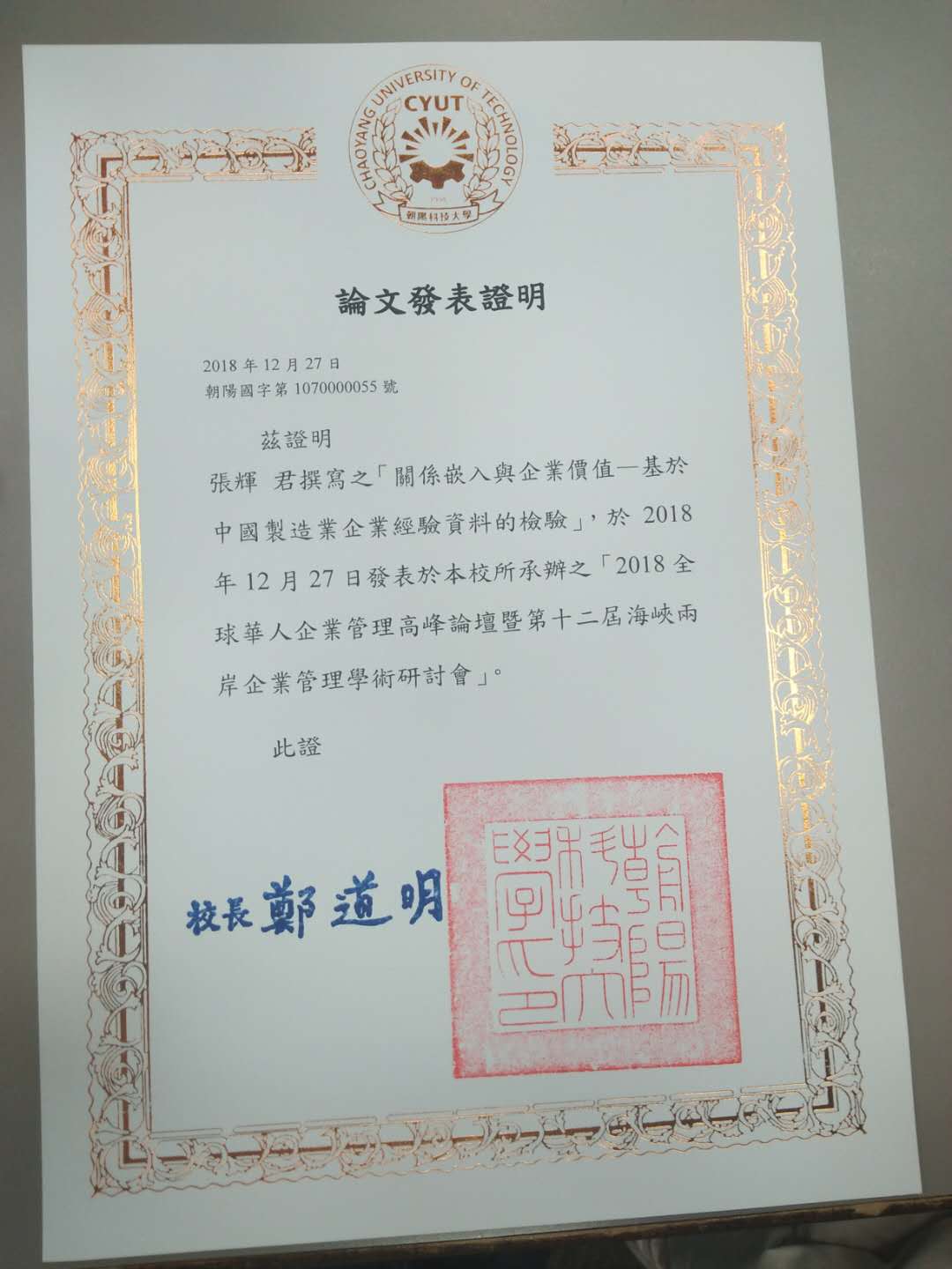 张辉同学于2018年12月26日-30日赴中国台湾朝阳科技大学参加“2018全球华人企业管理高峰论坛”,该论坛每年举办一次,是海峡两岸重要的学术沟通平台。本次论坛的主题是“智慧时代的企业创新”,分设了创新模式、组织创新与人资管理、行销管理、流通管理、金融科技、休闲管理、旅游管理、东方管理、电商管理、科技管理及其它有关议题。交流会上,张辉同学就申请并参加的新澳彩资料