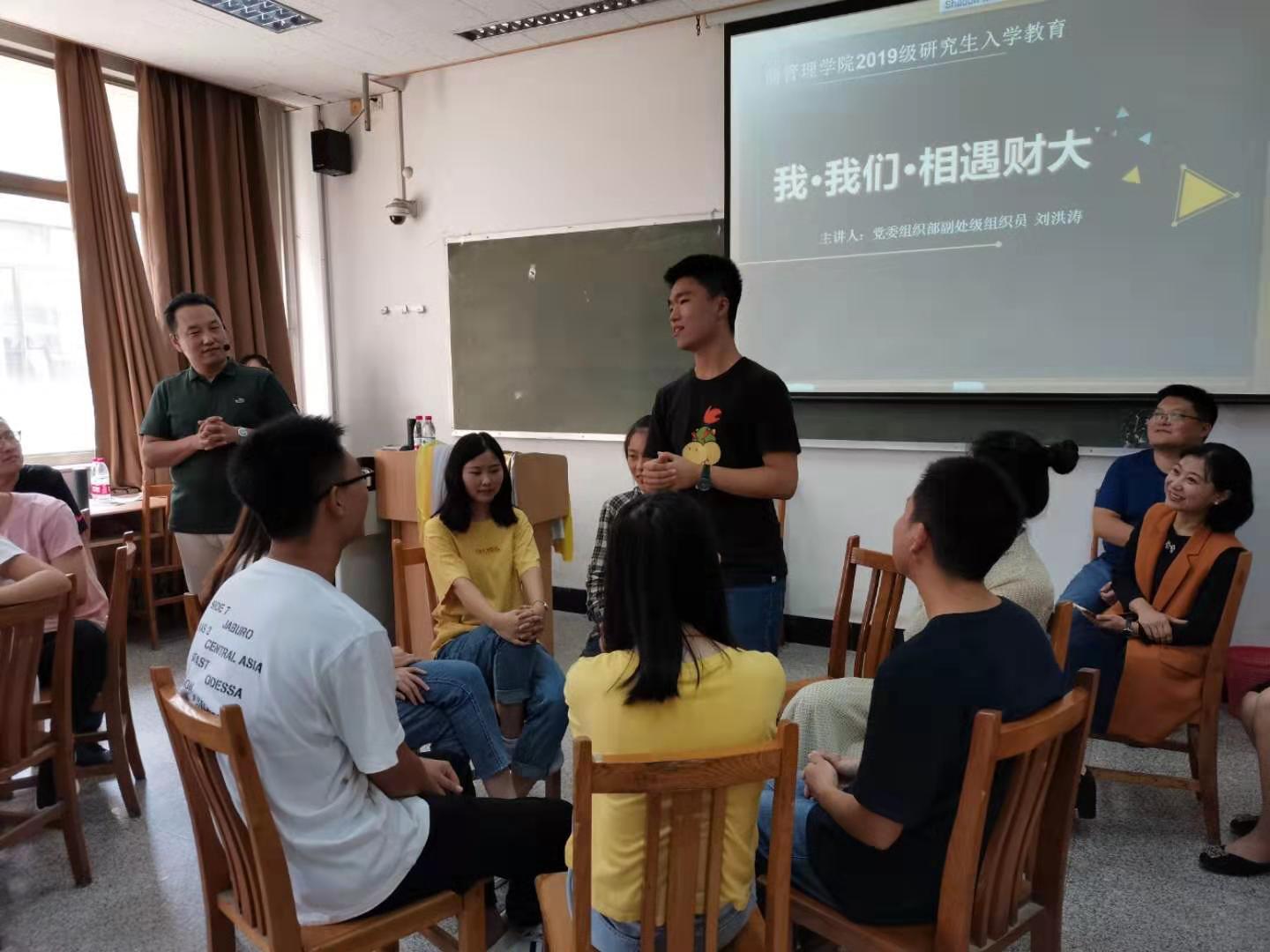 9月16日下午,我院2019级研究生入学团体心理辅导在2号教学楼2208教室举行。本次活动以“我 我们 相遇财大”为主题,旨在促进2019级研究生互相熟悉,深入了解,激发团体动力,促进团队建设。学校党委组织部副处级组织员、国家二级心理咨询师刘洪涛应邀带领活动,新澳彩资料党委副书记彭艳红、研究生辅导员尤泽民以及2019级全体研究生参加。