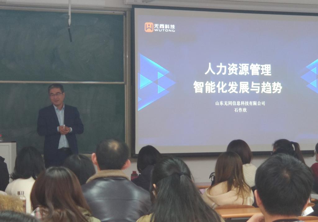 在圣井校区8-208教室召开“人力资源管理智能化发展现状与趋势”主题讲座。人力资源管理系副主任王学超,部分辅导员老师及全体17级学生聆听了此次讲座。山东无同信息科技有限公司董事长CEO石作欣担任本次讲座主讲人。