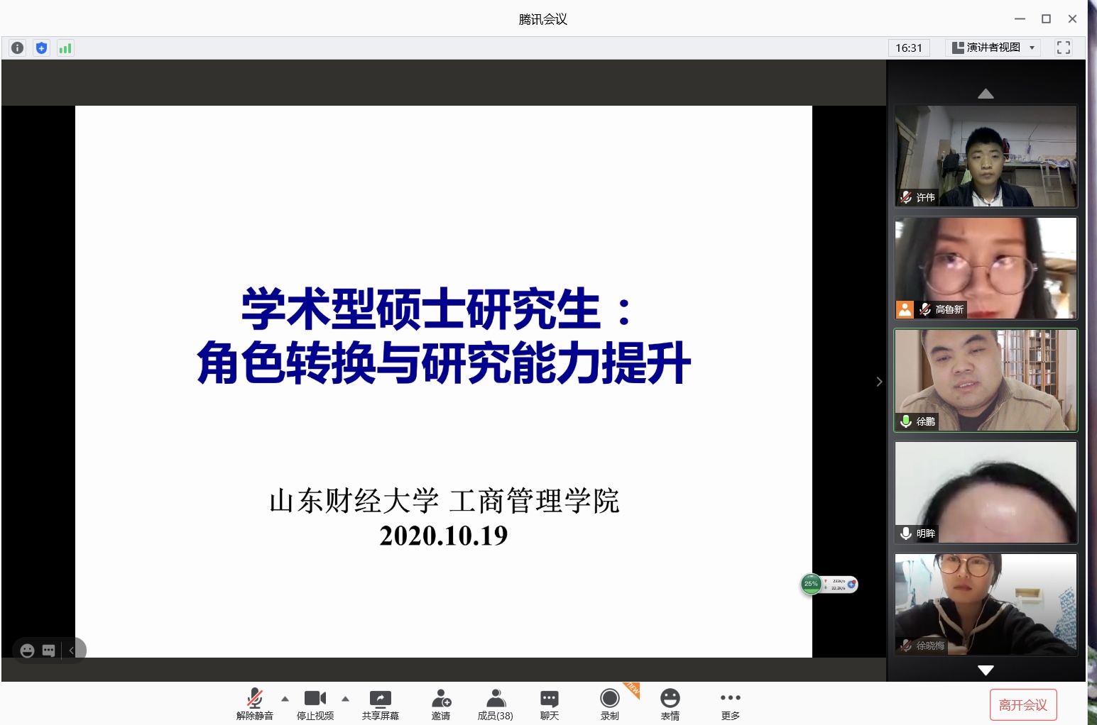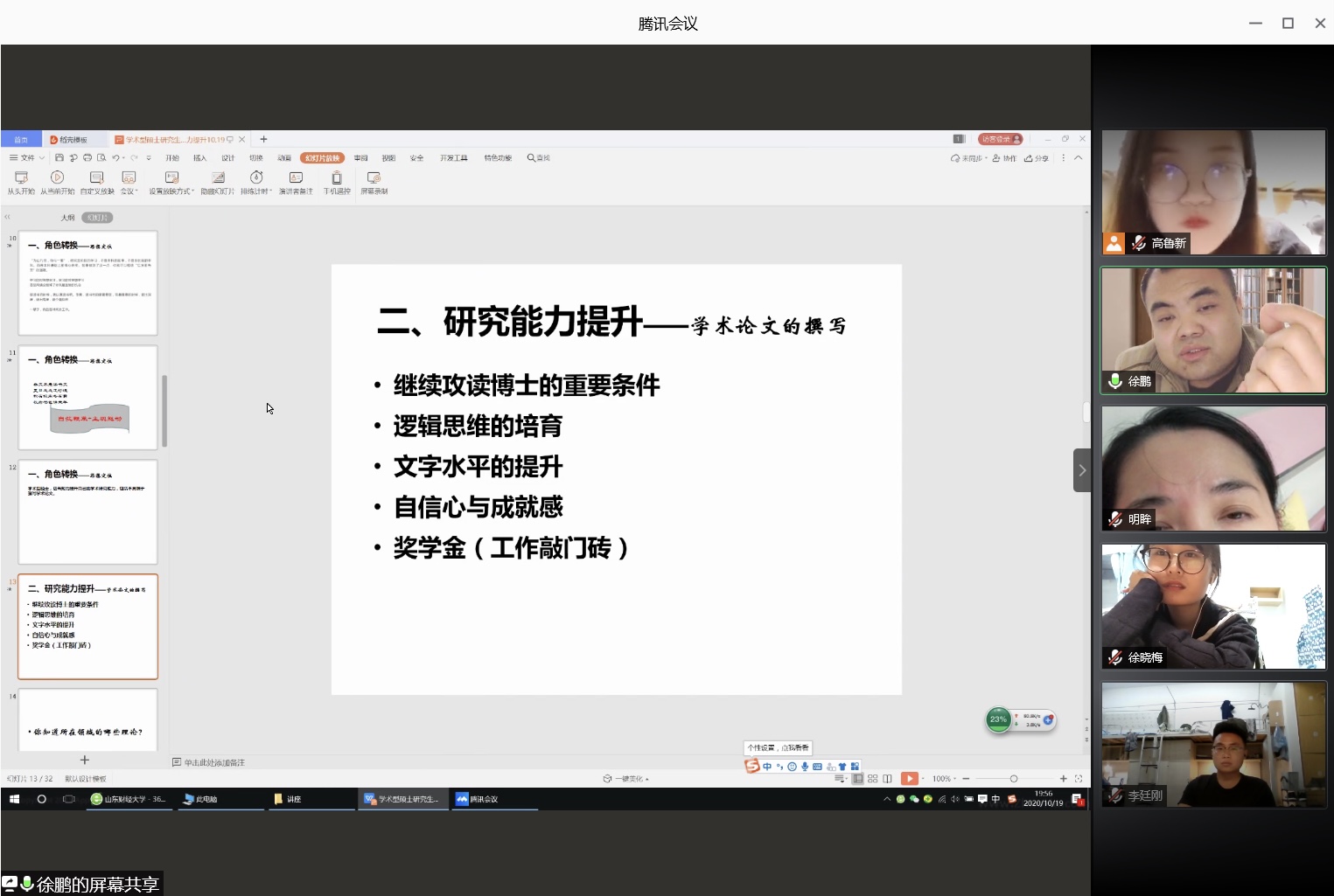 10月19日晚,我院研究生导师徐鹏为2020级研究生新同学做了“学术型硕士研究生:角色转换与研究能力提升”专题讲座,为适应当前疫情防控的需要,讲座采取了线上形式进行,讲座由研究生辅导员侯昭瑾主持。