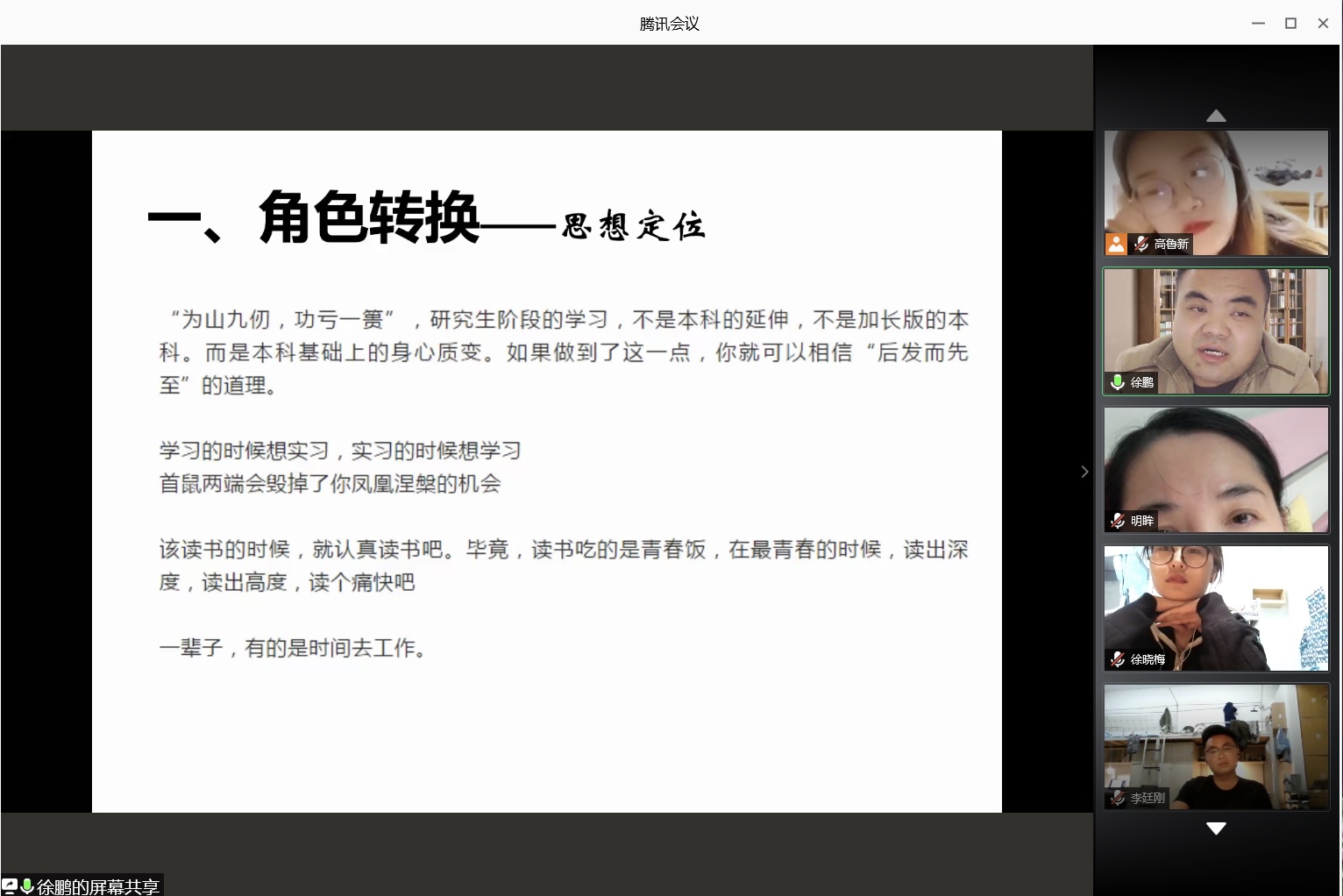 最后,徐鹏语重心长地对新生提出了加强身体锻炼、端正学术态度等建议,并祝愿2020级新同学度过一个丰富多彩的研究生生活。