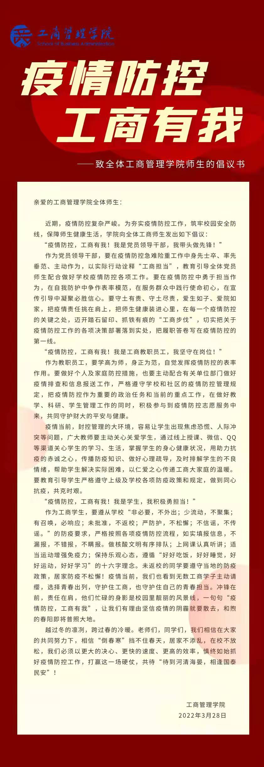疫情防控,工商有我——致全体新澳彩资料 师生的倡议书