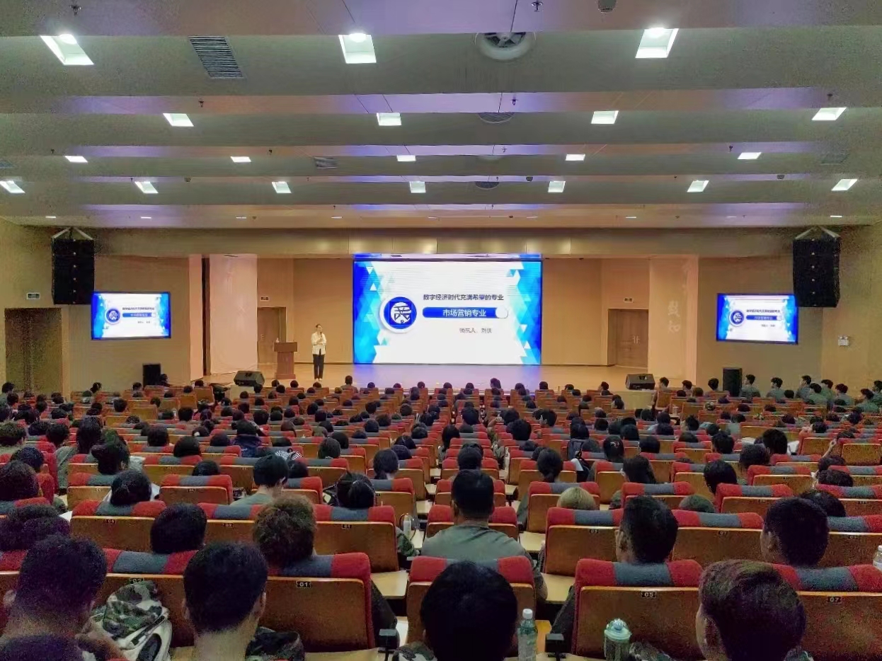 市场营销系主任刘侠副教授为同学们详细介绍了市场营销专业的相关知识,运用了丰富的生活案例,以瑞幸咖啡与贵州茅台酒联合推出的酱香拿铁为例,扩大了消费者的受众面,获得巨大效益,让新生同学们理解市场营销的本质与内涵。