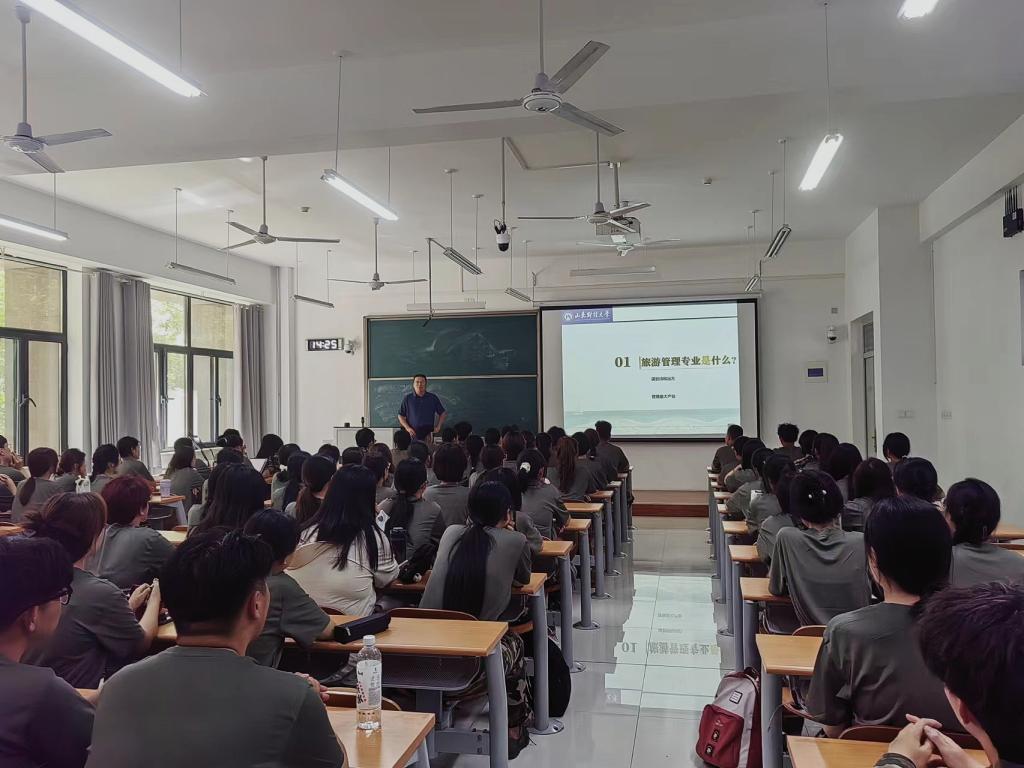文化和旅游系主任于伟副教授详细讲解了旅游管理专业是什么,对学生的素质要求,专业培养特色,教学体系和学科平台,职业生涯前景等内容,激发2023级新同学对专业探索的兴趣和热情,指引了学业发展方向。