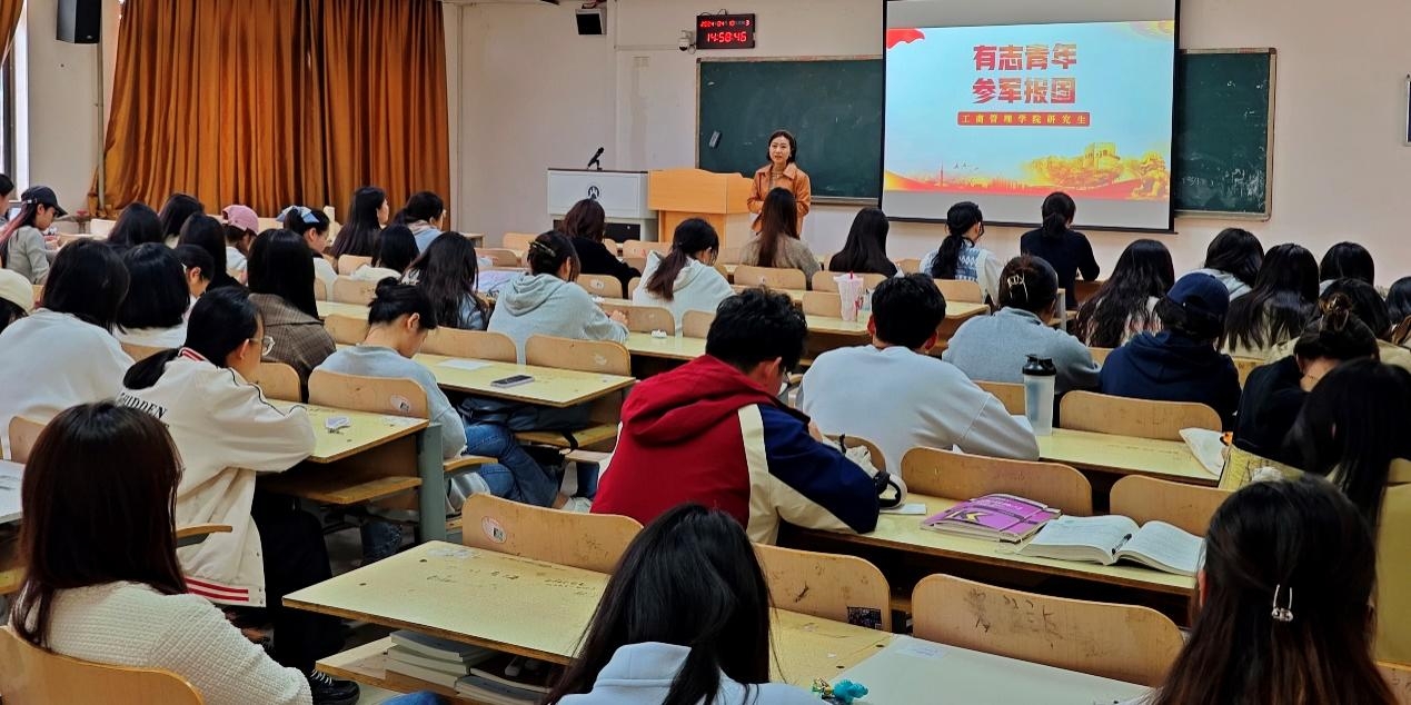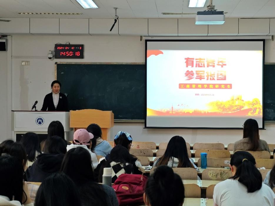 为贯彻落实2024年大学生征兵工作要求,鼓励大学生积极投身国防事业,4月10日下午,我院研究生在逸夫楼202开展以“有志青年 参军报国”为主题的征兵宣讲会。班会由研究生辅导员刘薇主讲,新澳彩资料党委副书记彭艳红和全体研究生参加。