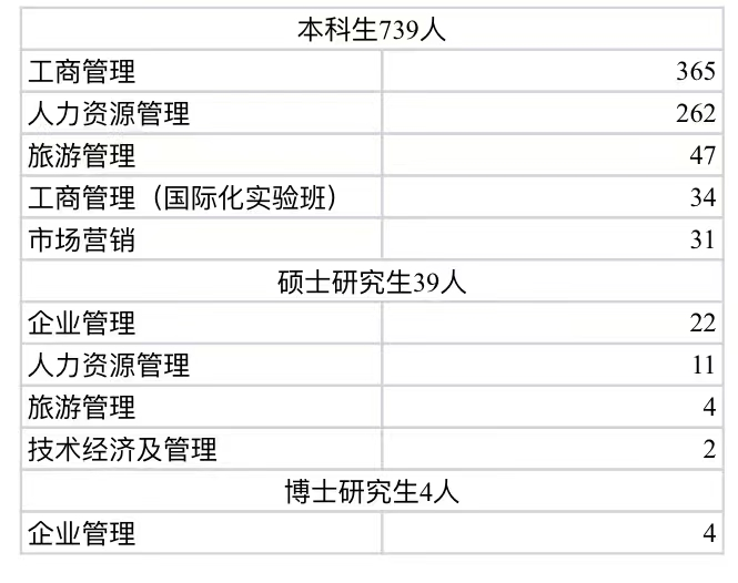 、人力资源管理、市场营销为国家一流本科专业建设点,设有战略管理、人力资源管理两个博士培养方向,企业管理、人力资源管理、旅游管理、技术经济及管理4个二级学科硕士学位授权点和旅游管理专业硕士学位(MTA)授权点。现有在校本科毕业生739人,硕士毕业生39人,博士毕业生4人。(新澳彩资料