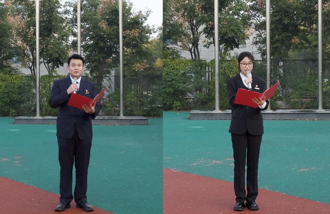 新澳彩资料师生代表先后在国旗下发言。辅导员王涵基于“新中国成立75周年,红军长征出发90周年”这一背景,阐述了长征精神的内涵和时代价值,“今天,虽不必战争,却仍需长征”,号召大家学习并弘扬长征精神,走好新时代的长征路。2024级学生代表高圣杰号召同学们坚定信念,保持开放心态,抓住机遇,迎接挑战,为祖国的建设添砖加瓦。