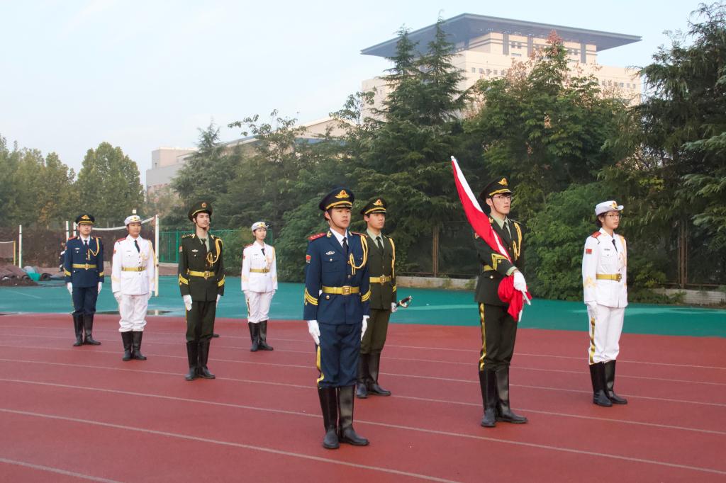七时整,升国旗仪式正式开始。歌曲《红歌颂》响起,国旗护卫队手握钢枪,护送鲜艳的五星红旗走向升旗台,在庄严肃穆的国歌中,国旗冉冉升起,全体师生齐唱国歌并行注目礼。