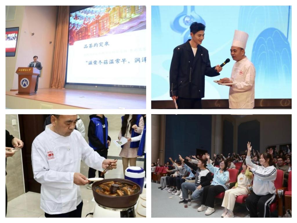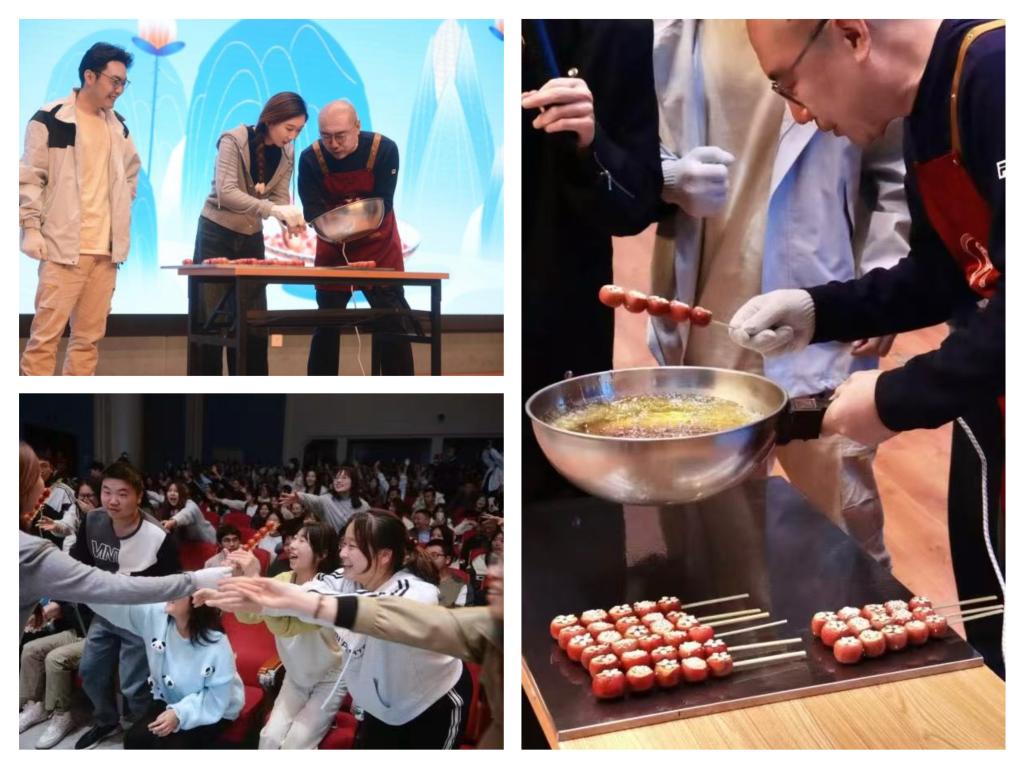 文旅融媒互动课堂集合了现场互动、沉浸体验、网络连线等方式,向同学们全面介绍了济南的泉水文化、名士文化和现代发展。学生代表与济南电视台主持人以音乐说唱的形式带来的原创节目《美丽泉城》,串联展示济南名士文化、红色文化、人才政策等,向同学们发出与美丽泉城同行的邀约。非遗传承人为大家提供了一次难得的近距离接触和体验非遗美食文化的机会。老济南酸蘸儿非遗传承人张正伦带领学生们一起制作酸蘸儿,体验非遗美食制作的乐趣。学生们不仅感受到了非遗美食文化的独特魅力,更对传承人们的精湛技艺和执着追求表示由衷的敬意。现场直播连线美好体验官小白、燕子,带领大家“云逛吃”济南特色美食地标芙蓉街、百花洲的特色美食,带大家了解泉水文化、文创产品,感受济南的烟火气。学生和主持人徐哲带来原创歌曲《吃在济南》。以歌曲形式分享济南特色名小吃,视频展现美食地标宽厚里、环联夜市等。主讲人朱晓宽以“文旅+特色美食+美食地标”的方式,趣味分享特色鲁菜、泉水宴的独特文化内涵和城市故事。与此同时,超意兴餐饮有限公司行政总厨谢兆新上台分享“济南人的心头肉”——把子肉的故事。学生们“吃着肉听着课”,还能赢得把子肉味儿冰激凌券,收获满满。