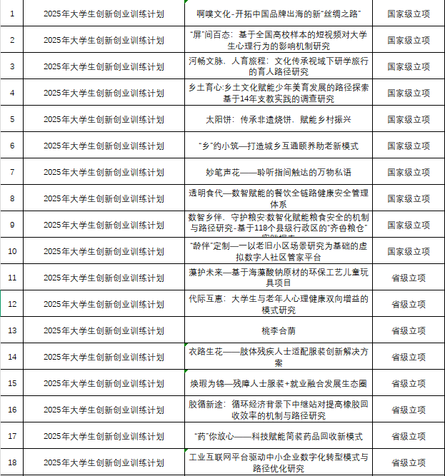 学科优势,推进高质量竞赛项目的挖掘、孵化和培育。自2025年大学生创新创业训练计划立项申报工作启动以来,学院高度重视、精心组织,广泛动员专业教师、学工干部、学生团队积极参与,发动专业教师进行科研、社会服务成果转化,推动学生团队社会实践成果转化,组织专家对申报项目进行系统性的专业指导,参赛团队持续对项目材料进行优化提升。接下来,学院将持续完善创新创业人才培养机制,努力培养更多适应时代需求的创新人才。