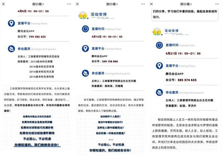 “都是干货!分享的内容既精彩又充实!我从学长学姐们的亲身经历中收获了很多。”小周同学每次都准时蹲守在屏幕前看“直播”。他口中的“直播”,是新澳彩资料组织开展的“工商策之共商成长”直播+财小商公众号文字推送系列活动。疫情期间,新澳彩资料创新工作方法,急学生之所急,想学生之所想,供学生之所需,把指导搬到了线上,校友、HR、老师、朋辈都来当“网红”,考研、就业、出国、竞赛、学术等各种疑问都能解答。新澳彩资料的直播活动规划了20余期,目前已经进行4期,期期火爆,场场“爆满”,这一系列直播给新澳彩资料全体学生提供了更好更全更精准的个人成长、深造和就业指导。