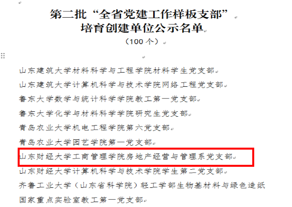 近日中共山东省委教育工委发布了“关于公布第二批山东党建工作示范高校、标杆院系、样板支部培育创建单位名单的通知”,我院房地产经营与管理系党支部获批第二批“山东党建工作样板支部”培育创建单位。