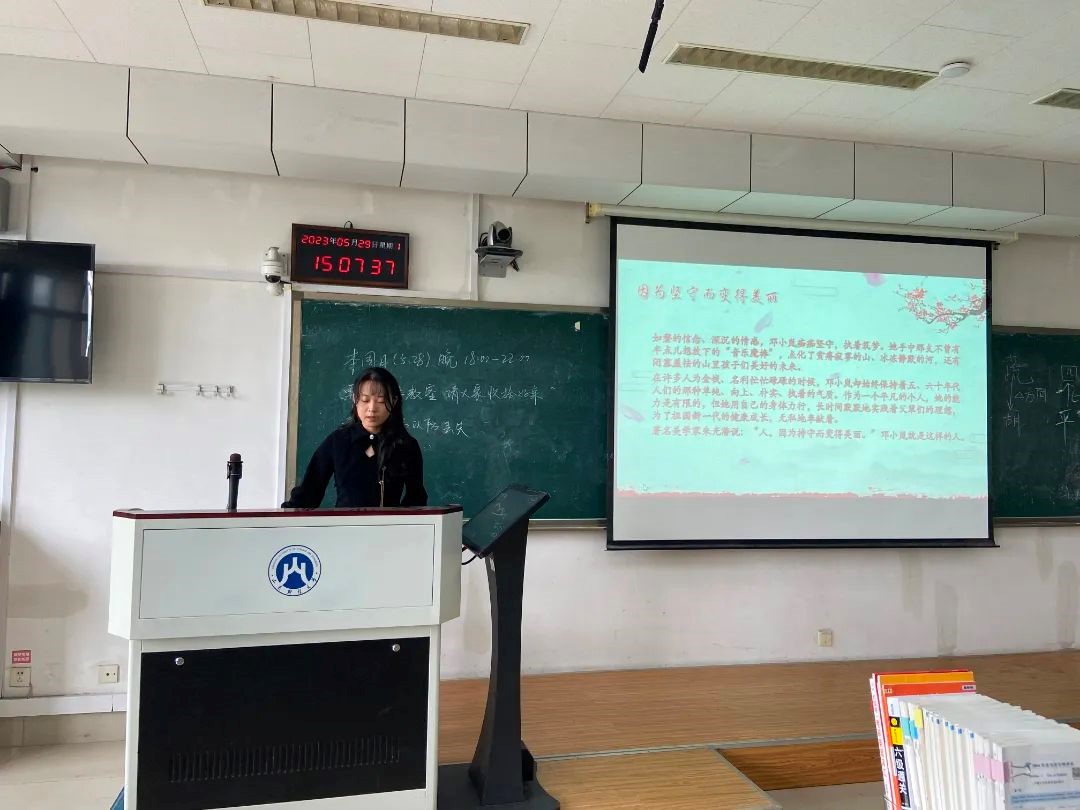 首先,胡文颖同学为大家分享了邓小岚同志的先进事迹。2004年退休之后,邓小岚同志只身扎根马兰村18年,从事儿童音乐教育事业,于大山深处深耕筑梦。18年间,她无怨无悔、始终不渝,每年从北京往返马兰村20余次,来回奔波了20多万公里,大约能绕地球赤道5圈。在2022年北京冬奥会的开幕式上,邓小岚同志创办的马兰花童声合唱团用希腊语向全世界唱响了《奥林匹克颂》,展现了山区孩子的动人风采,打动了全球亿万观众的心。
