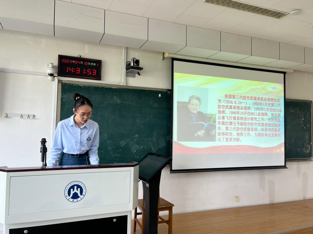 首先,研学会陈世娇同学为大家分享了沈忠芳先生的先进事迹。他隐姓埋名、淡薄名利,是《导弹人生》书中12位已经过了脱密期的中国导弹总指挥总设计师之一。如今,89岁的沈忠芳终于走进公众视野。他在炮火中燃起报国心,少时许下造飞机的宏愿,毕业后进入国防部从事导弹研制工作,带领中国导弹走出国门。沈忠芳先生说“人生最大的幸福,莫过于为人民的幸福奋斗”。他用自己的实际行动和成就诠释了爱国主义和奉献精神的内涵和价值。